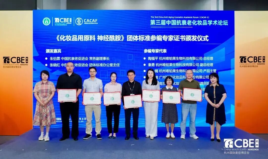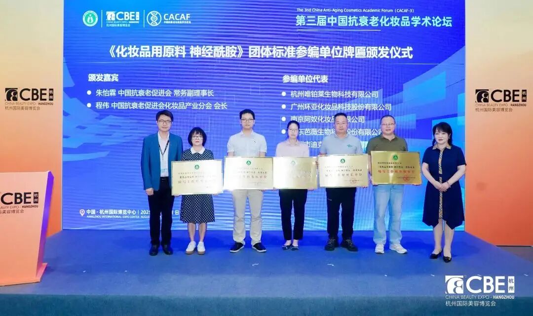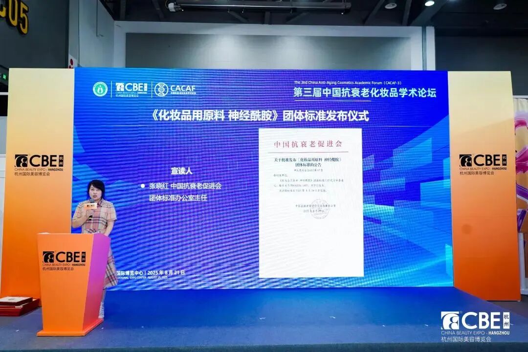 2025年8月21日,第三届中国抗衰老化妆品学术论坛(CACAF-3)在杭州国际博览中心盛大开幕。作为论坛核心环节之一,《化妆品用原料 神经酰胺》(标准编号:T/ZGKSL 024—2025)团体标准发布仪式隆重举行,标志着中国化妆品原料行业在安全性、规范性和科技性领域迈出关键一步。该标准由中国抗衰老促进会归口管理。 《化妆品用原料 神经酰胺》团体标准自立项之初便肩负着重要使命 —— 填补国内神经酰胺原料标准空白,推动中国化妆品行业从长期以来的 “技术跟随” 模式,向 “标准引领” 的高阶发展阶段转型。为确保标准的科学性、严谨性与实用性,标准制定工作由中国抗衰老促进会化妆品产业分会牵头,联合多方力量共同推进,参与单位涵盖 15 家机构及企业,包括杭州唯铂莱生物科技有限公司、清华大学第一附属医院、山东省药学科学院、杭州颐唯实检测科技有限公司、广州环亚化妆品科技股份有限公司、南京阿奴化妆品有限公司、谷雨生物科技集团股份有限公司、广东芭薇生物科技股份有限公司、广州市仙迪生物科技有限公司、厦门海尼新创生物科技有限公司、深圳市迪克曼生物科技有限公司、上海瀛珈生物科技有限公司、广州市海诗生物科技有限公司、国粹国妆(北京) 文化艺术有限公司等,形成了 “产学研用” 深度融合的标准研制格局。 发布仪式上,首先由中国抗衰老促进会团体标准办公室主任张晓红宣读了团体标准发布公告。张晓红主任强调了该标准对于规范神经酰胺原料市场、保障化妆品质量安全的重要性,为后续的发布环节奠定了坚实基础。 随后,进入关键的《化妆品用原料 神经酰胺》团体标准发布仪式。来自科研院校、医疗机构、行业企业等多领域的专家与代表共同登台,见证了这一重要标准的诞生。 发布嘉宾分别是: 朱怡霖 中国抗衰老促进会 常务副理事长 张晓红 中国抗衰老促进会 团体标准办公室主任 孙立波 中国抗衰老促进会化妆品产业分会 副会长 郎 娜 中国中医科学院西苑医院 主任医师 谢志辉 北京国妆科创自然科学研究院执行院长 沈 涛 杭州唯铂莱生物科技有限公司 美妆事业部总经理 王 峥 梅晔生物医药股份有限公司 研发总监 何敬愉 广州环亚化妆品科技股份有限公司原料创新研发中心 研发总监 多元领域的嘉宾阵容齐聚,充分体现了行业各界对该标准的高度认可与全力支持,也彰显了标准制定的广泛代表性与权威性。 标准发布后,仪式迎来授牌与颁证环节,以此表彰在标准制定过程中作出突出贡献的单位与个人。在参编单位授牌环节,中国抗衰老促进会常务副理事长朱怡霖,与中国抗衰老促进会化妆品产业分会会长、《中国化妆品科学》期刊主编程伟为部分参编单位颁发荣誉牌匾。这些单位凭借自身在技术研发、生产实践、检测认证等领域的专业优势,全程深度参与标准研讨、内容起草与验证工作,为标准的科学性、实用性与可操作性提供了关键支撑。 紧接着的参编专家颁证环节,朱怡霖常务副理事长与张晓红主任为部分参编专家颁发荣誉证书。据悉,《化妆品用原料 神经酰胺》团体标准的起草团队汇聚了行业多位资深专家,起草人包括陶福平、程伟、李娅、庄淑波、孟祥璟、王楠、贾爱玲、何敬愉、李安章、李适炜、孙永、秦勇、杨超文、李一楠、刘琴、赵继华、殷传江、渠丽娜。在标准研制的数个月里,起草专家团队凭借深厚的专业知识储备与丰富的行业实践经验,反复论证技术指标、优化检测方法,攻克了多项关键技术难题,最终确保了标准的高质量完成。 此次《化妆品用原料 神经酰胺》团体标准的发布,其意义远超单一标准本身。从行业实践层面,它首次为神经酰胺原料的生产工艺、质量指标、检测方法及应用规范提供了统一的科学依据,有效解决了此前行业内 “无标可依” 的困境;从行业发展维度,它将进一步推动中国化妆品行业向 “精准护肤” 与 “可持续发展” 转型,为消费者带来更安全、更有效、更具针对性的护肤产品。中国抗衰老促进会化妆品产业分会会长程伟强调:“神经酰胺标准的实施,将成为行业发展的重要转折点 —— 它将促使企业从过去的‘概念营销’转向‘实证研发’,例如通过基因组学、皮肤生理学等前沿技术,深入解析不同肤质人群对神经酰胺的吸收、代谢差异,最终实现个性化护肤方案的规模化落地,让科技真正赋能护肤。” 作为第三届中国抗衰老化妆品学术论坛(CACAF-3)的重要成果,《化妆品用原料 神经酰胺》团体标准的发布,标志着中国抗衰老化妆品产业正式进入 “标准驱动创新” 的新阶段。未来,中国抗衰老促进会化妆品产业分会将持续发挥平台纽带作用,联合更多行业企业、科研机构与专家学者,不断完善化妆品原料标准体系,推动更多关键原料实现 “有标可循、有标必依”,为全球化妆品行业贡献高质量的 “中国方案”,助力中国化妆品产业在国际舞台上树立更高话语权。
