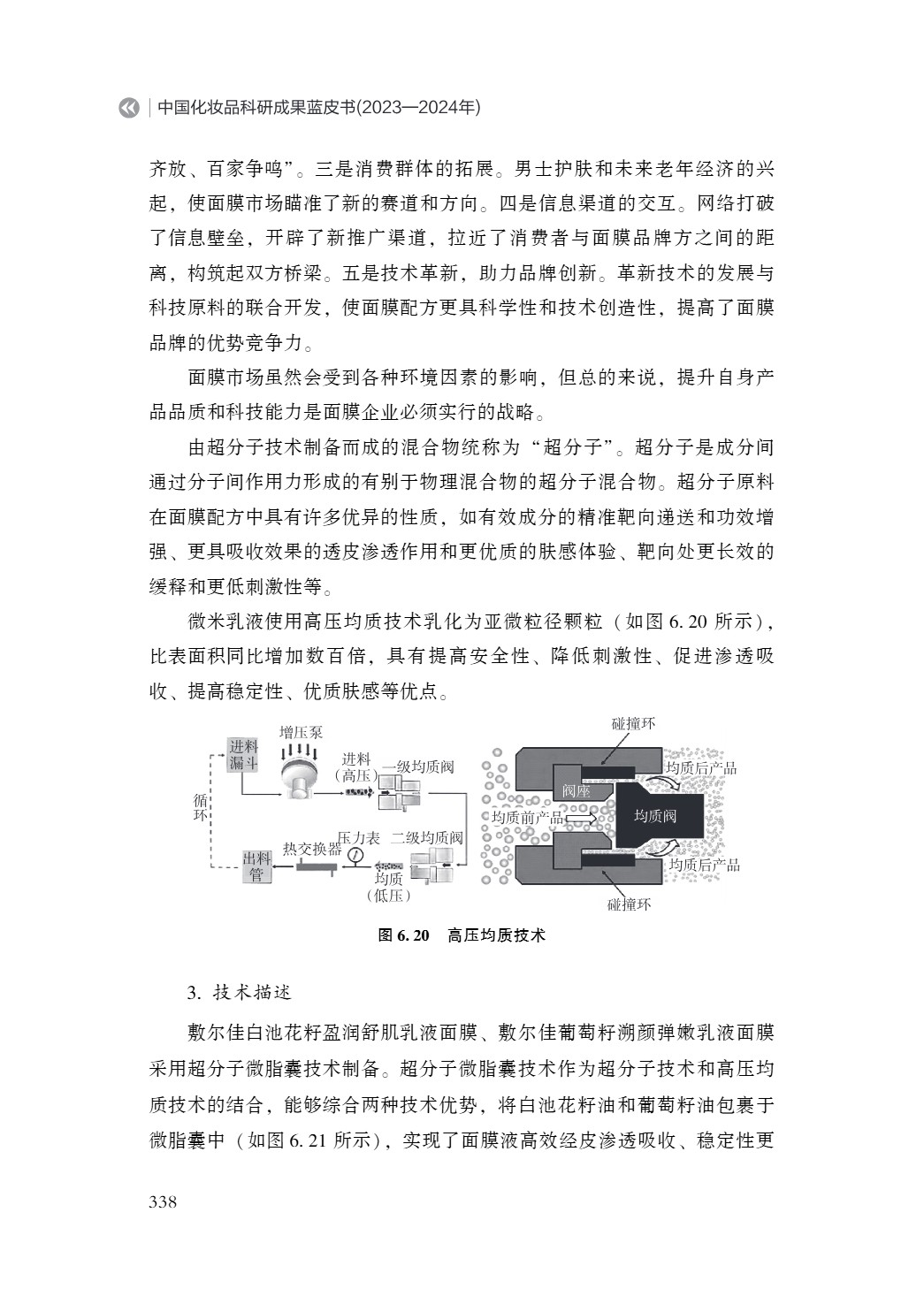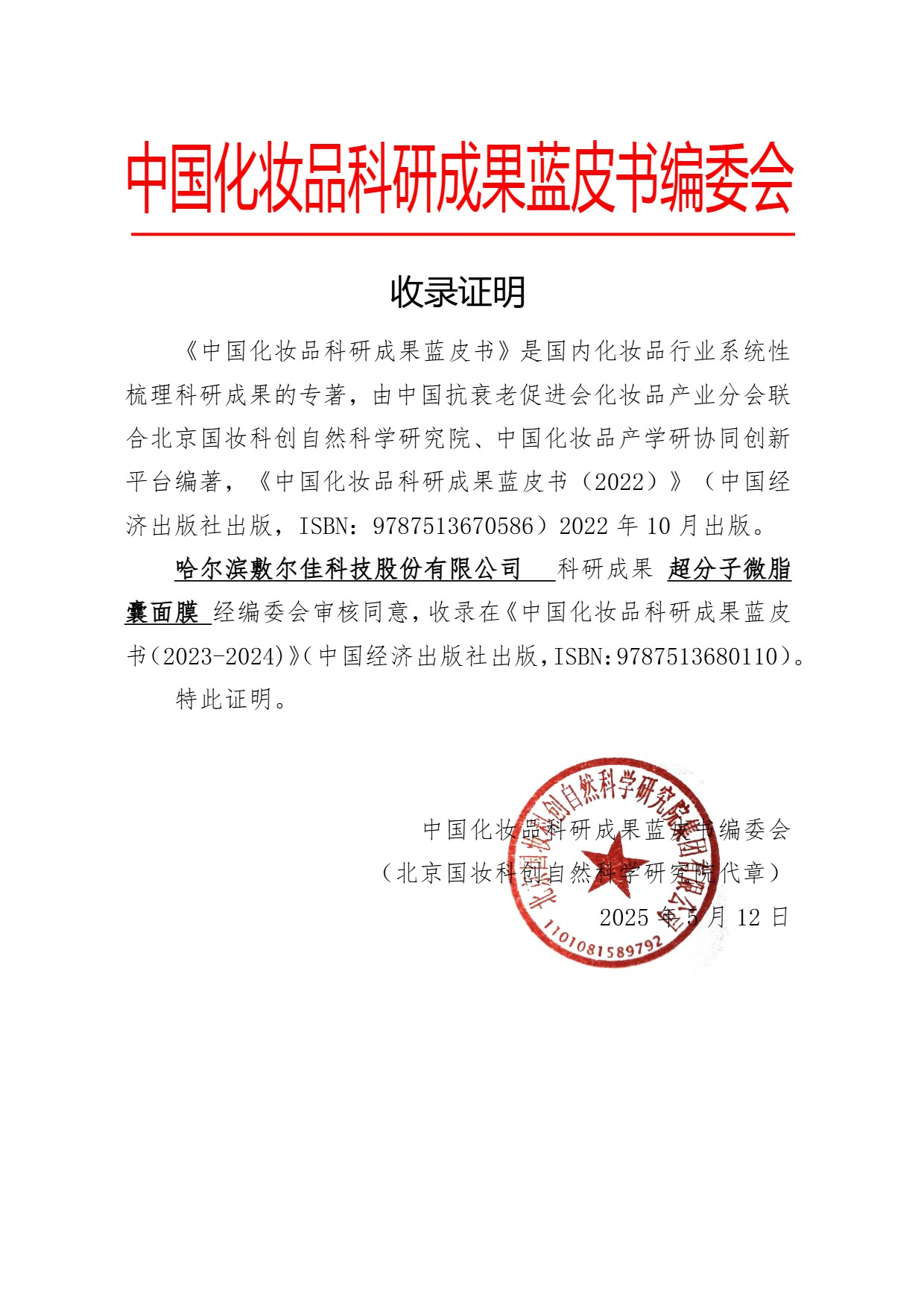《中国化妆品科研成果蓝皮书(2023—2024 年)》由中国抗衰老促进会化妆品产业分会、北京国妆科创自然科学研究院以及中国化妆品产学研协同创新平台共同组织。全书580页,57.8万字ISBN978-7-5136-8011-0,中国经济出版出版。 蓝皮书是由国内100多位来自高校院所与企业的专家精心打造的行业权威著作,汇集了超百位科研工作者的卓越智慧与辛勤付出。作为美妆科研领域的里程碑式著作,蓝皮书自问世以来,便以“全面性、深入性、专业性”的三大特质,赢得产学研各界高度赞誉!填补国内该领域学术梳理空白,为行业制定标准、技术革新、产业升级提供权威战略指南。 哈尔滨敷尔佳科技股份有限公司成立于2017年,是一家在专业皮肤护理领域具备广泛市场认知度与品牌影响力的企业,专注于产品的研发、生产与销售。公司紧密跟随消费者需求变化,实施精准营销策略,依托国货崛起的消费新动力和广泛布局的专业渠道,持续积淀品牌力与产品力。 目前,在售产品涵盖医疗器械类敷料产品及功能性护肤品,以敷料和贴、膜类产品为主打,并逐步拓展至水、精华、乳液、喷雾、冻干粉等多种形态。通过线上线下相结合的多元销售策略,公司已构建起覆盖广泛的终端销售矩阵。 超分子微脂囊面膜