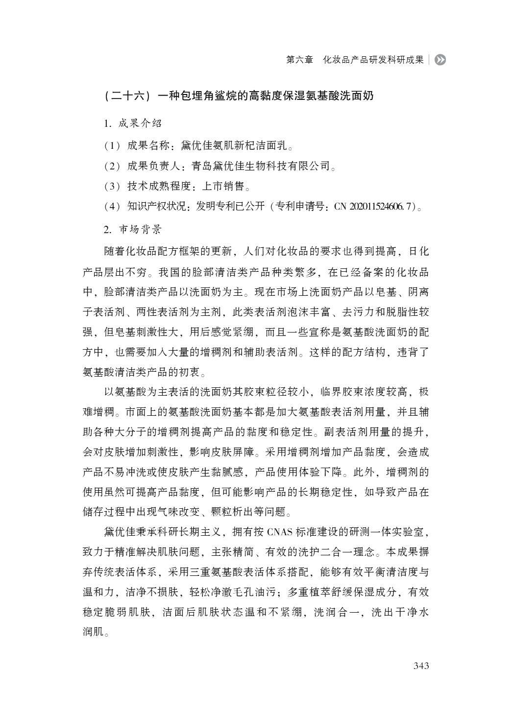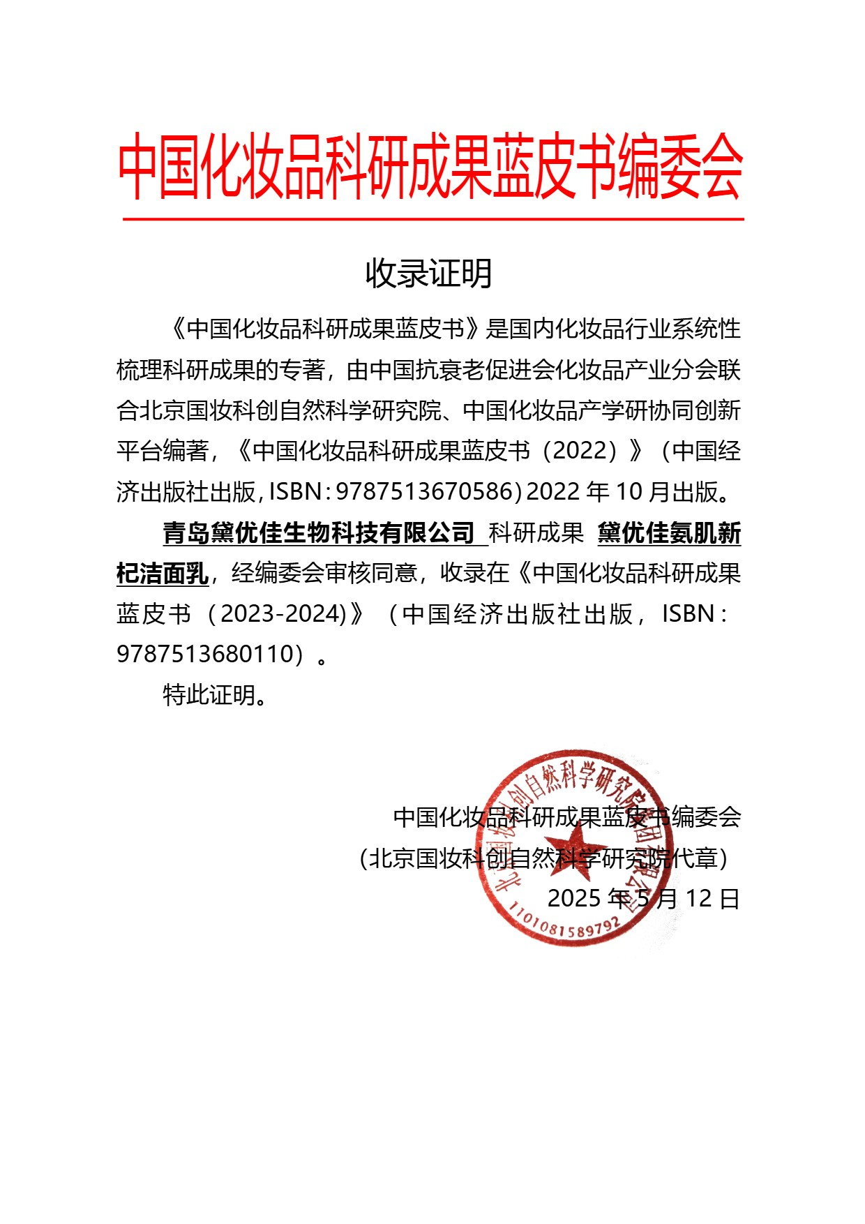 《中国化妆品科研成果蓝皮书(2023—2024 年)》由中国抗衰老促进会化妆品产业分会、北京国妆科创自然科学研究院以及中国化妆品产学研协同创新平台共同组织。全书580页,57.8万字ISBN978-7-5136-8011-0,中国经济出版出版。 蓝皮书是由国内100多位来自高校院所与企业的专家精心打造的行业权威著作,汇集了超百位科研工作者的卓越智慧与辛勤付出。作为美妆科研领域的里程碑式著作,蓝皮书自问世以来,便以“全面性、深入性、专业性”的三大特质,赢得产学研各界高度赞誉!填补国内该领域学术梳理空白,为行业制定标准、技术革新、产业升级提供权威战略指南。 青岛黛优佳生物科技有限公司成立于2015年7月6日,位于山东省青岛市。公司业务范围涵盖生物技术开发、咨询与转让,同时销售化妆品、日用百货、文具用品、珠宝首饰、工艺品、电子产品、数码产品、包装材料及卫生用品等。此外,公司还从事医疗器械经营(凭食药监部门许可证经营)、科技信息咨询服务,以及货物与技术的进出口业务。 黛优佳氨肌新杞洁面乳
