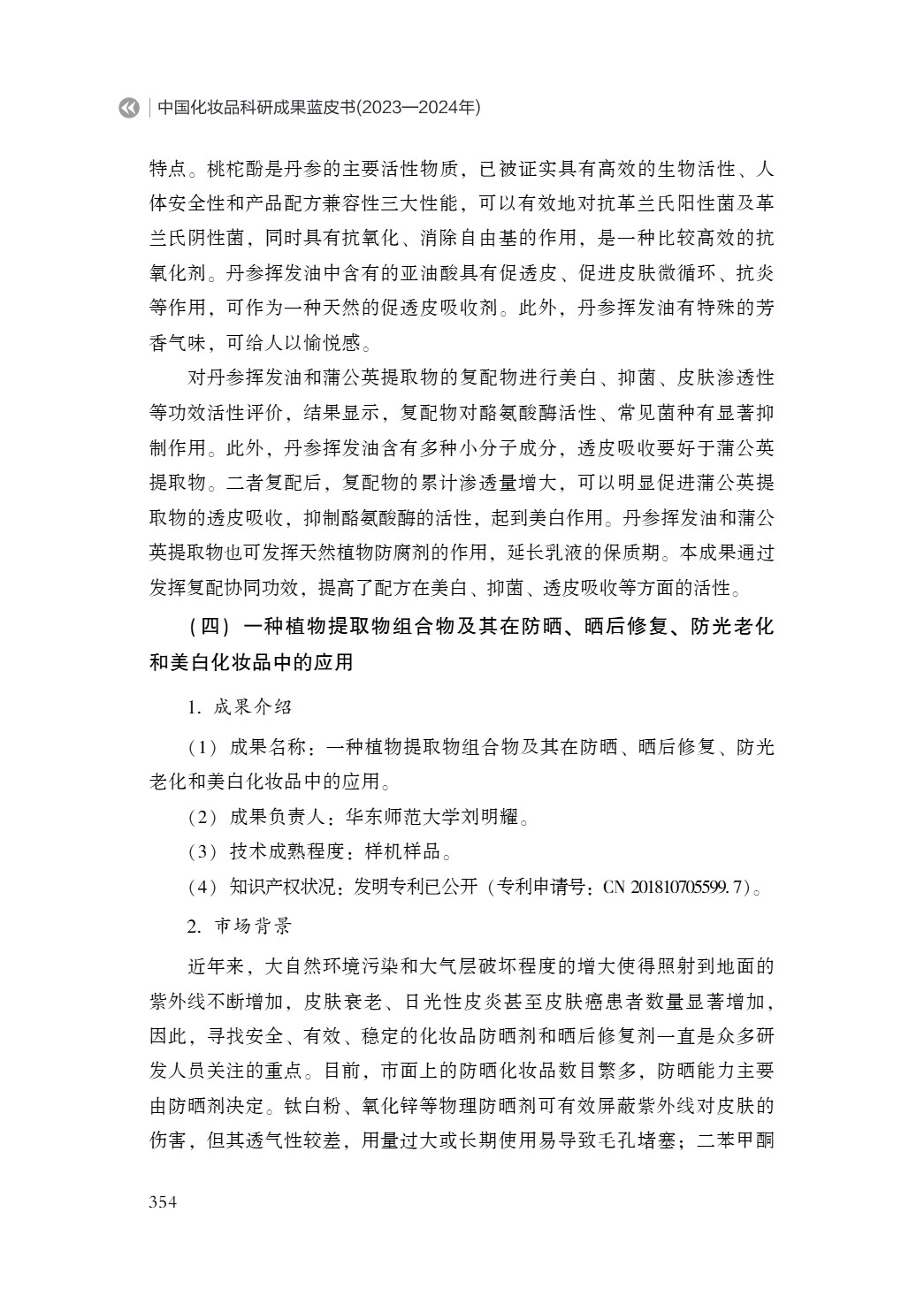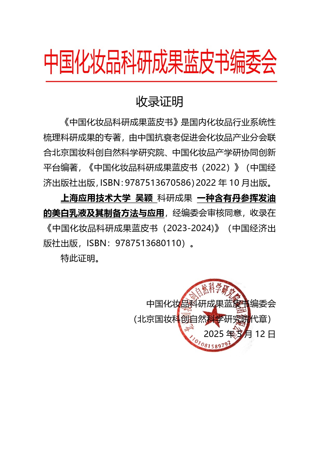 《中国化妆品科研成果蓝皮书(2023-2024)》成果展示|上海应用技术大学吴颖:一种含有丹参挥发油的美白乳液及其制备方法与应用 日期: 2025-12-04 来源: 浏览: 12