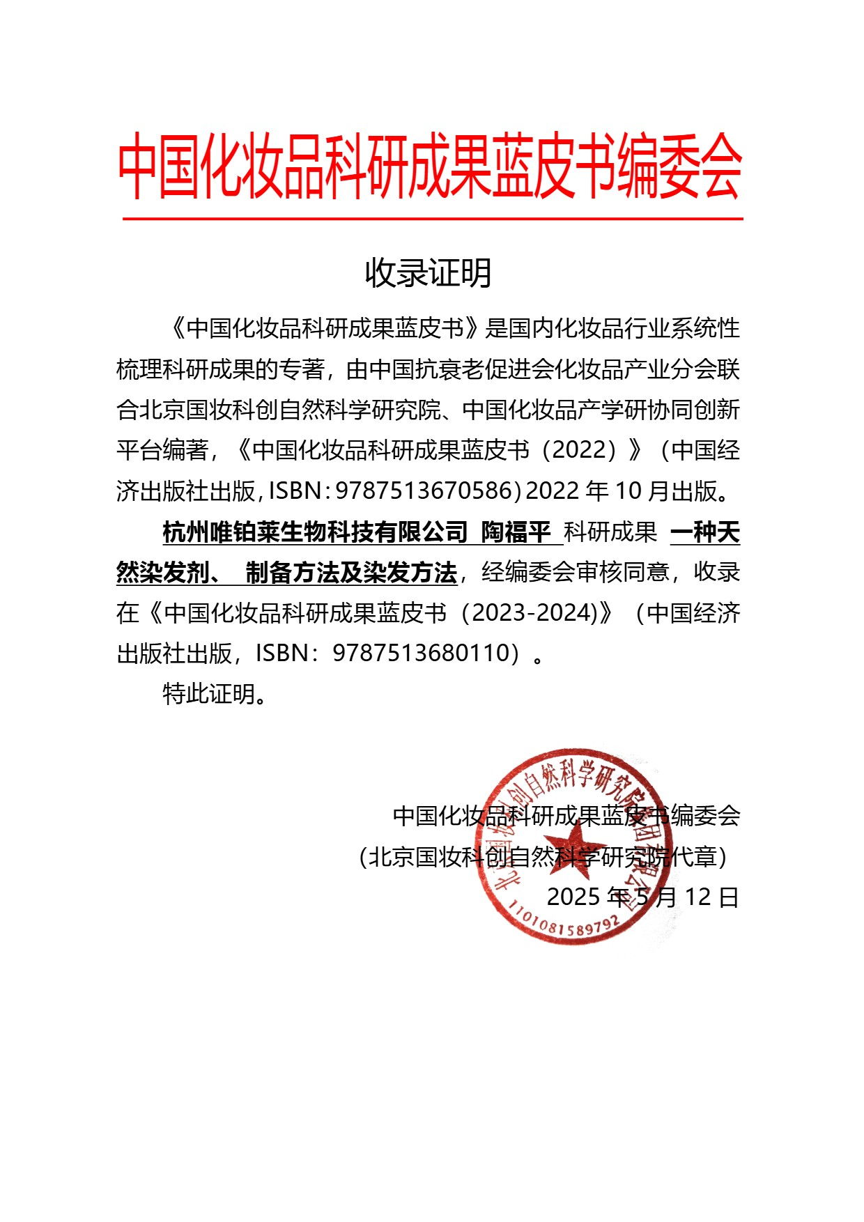 中国化妆品科研成果蓝皮书(2023-2024)》成果展示|杭州唯铂莱生物科技有限公司陶福平:一种天然染发剂、 制备方法及染发方法 日期: 2025-12-12 来源: 浏览: 7