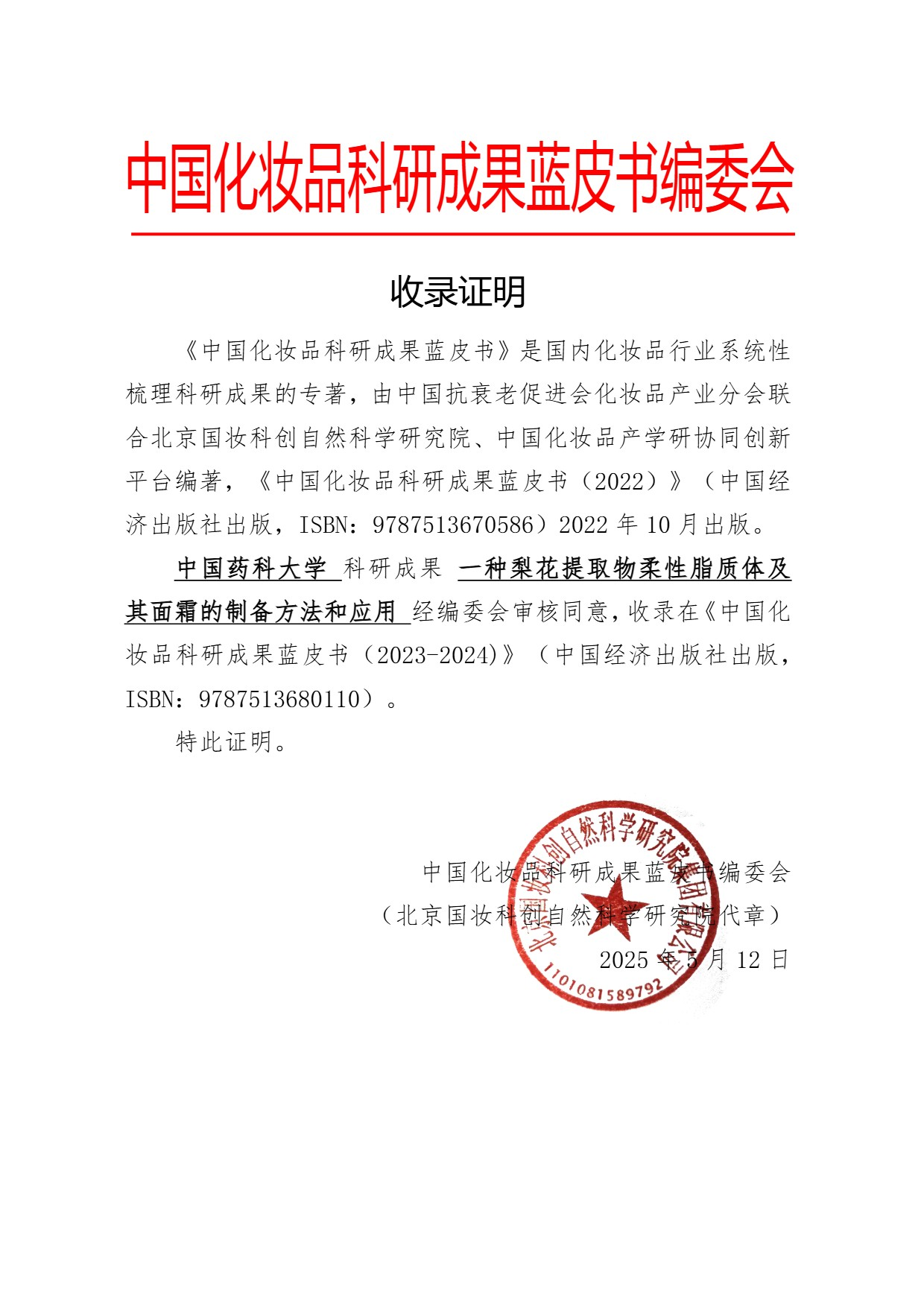 中国化妆品科研成果蓝皮书(2023-2024)》成果展示|中国药科大学:一种梨花提取物柔性脂质体及其面霜的制备方法和应用 日期: 2026-01-15 来源: 浏览: 59