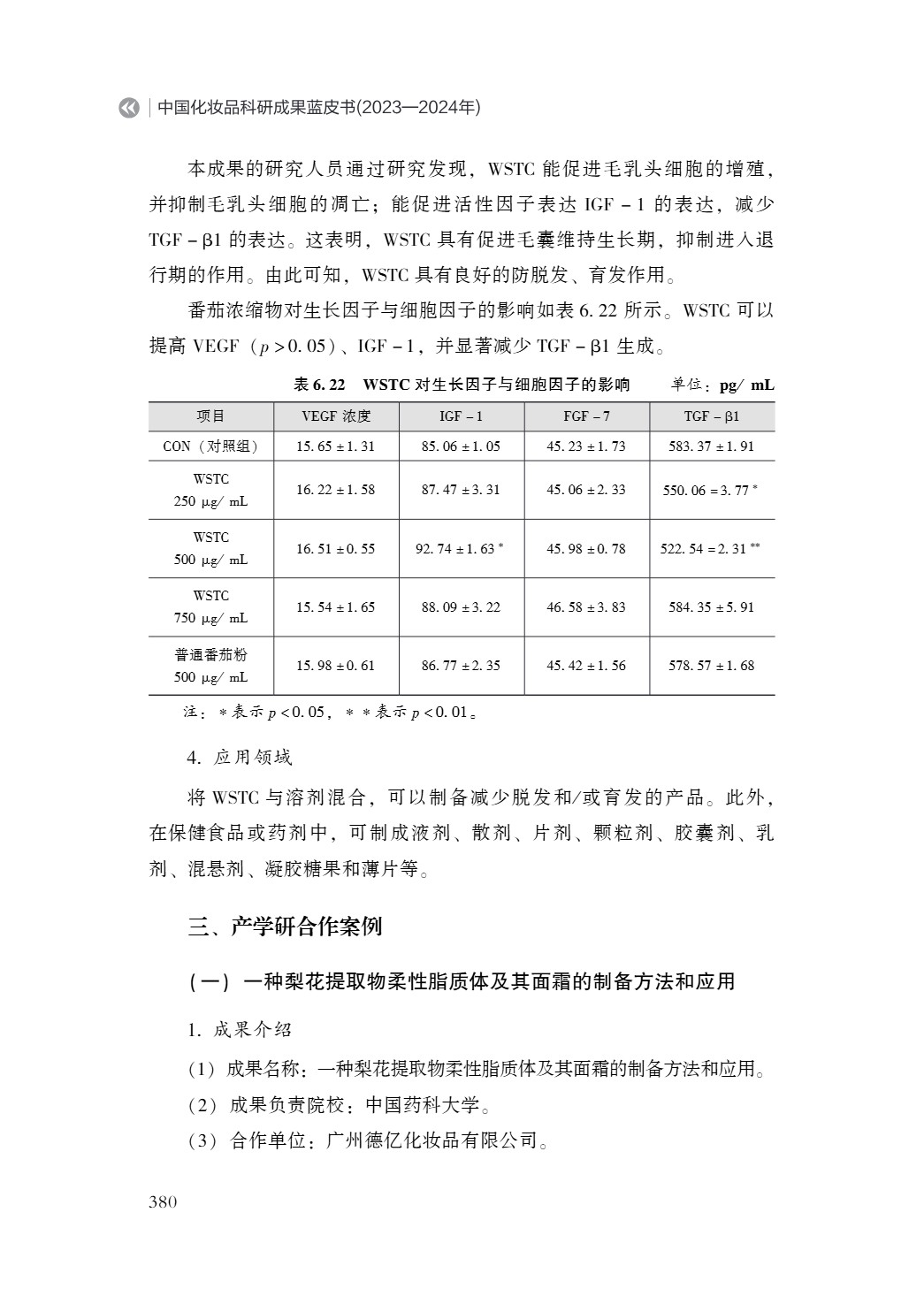 《中国化妆品科研成果蓝皮书(2023—2024 年)》由中国抗衰老促进会化妆品产业分会、北京国妆科创自然科学研究院以及中国化妆品产学研协同创新平台共同组织。全书580页,57.8万字ISBN978-7-5136-8011-0,中国经济出版出版。 蓝皮书是由国内100多位来自高校院所与企业的专家精心打造的行业权威著作,汇集了超百位科研工作者的卓越智慧与辛勤付出。作为美妆科研领域的里程碑式著作,蓝皮书自问世以来,便以“全面性、深入性、专业性”的三大特质,赢得产学研各界高度赞誉!填补国内该领域学术梳理空白,为行业制定标准、技术革新、产业升级提供权威战略指南。 成果负责院校: 中国药科大学 中国药科大学坐落于南京,始建于1936年,是我国第一所由国家创办的药学高等学府。学校是教育部直属高校,入选国家“211工程”、“985工程优势学科创新平台”和“双一流”建设高校,以药学、中药学学科为龙头,药学学科群建设国内领先。学校现有玄武门、江宁两个校区,设有30个本科专业(类),4个一级学科博士点。药学学科在全国第四轮学科评估中获评A+,药理学与毒理学进入ESI全球前万分之一。学校致力于新药研发,建有全国重点实验室,多项成果获国家级科技奖励,正加快建设药学特色世界一流大学。 合作单位: 广州德亿化妆品有限公司 广州德亿化妆品有限公司成立于2008年4月25日,注册资本500万元,法定代表人康志波。公司位于广州市白云区民营科技园,主要从事化妆品批发零售,兼营医疗器械、预包装食品等。2023年获得高新技术企业认定,持有255项商标和19项专利。 一种梨花提取物柔性脂质体及其面霜的制备方法和应用