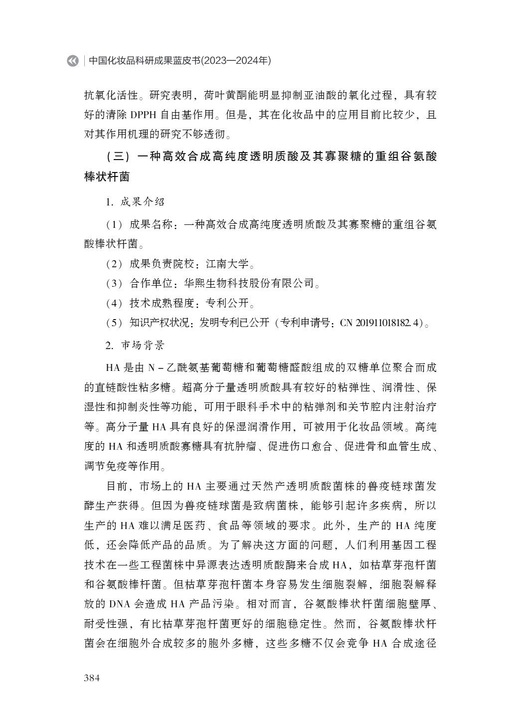 《中国化妆品科研成果蓝皮书(2023—2024 年)》由中国抗衰老促进会化妆品产业分会、北京国妆科创自然科学研究院以及中国化妆品产学研协同创新平台共同组织。全书580页,57.8万字ISBN978-7-5136-8011-0,中国经济出版出版。 蓝皮书是由国内100多位来自高校院所与企业的专家精心打造的行业权威著作,汇集了超百位科研工作者的卓越智慧与辛勤付出。作为美妆科研领域的里程碑式著作,蓝皮书自问世以来,便以“全面性、深入性、专业性”的三大特质,赢得产学研各界高度赞誉!填补国内该领域学术梳理空白,为行业制定标准、技术革新、产业升级提供权威战略指南。 成果负责院校: 山东省药学科学院 山东省药学科学院是省属公益二类科研单位,聚焦生物药物、化学药物、糖药物等领域的自主创新研发。承担多项国家级平台与课题,累计获新药及医疗器械证书200余项、省部级以上奖励90余项,成果转化率达95%以上。拥有科研人员300余人,包括高级职称120余人,并设有院士工作站和博士后科研工作站,致力于医药创新与产业发展。 合作单位:山东福瑞达生物工程有限公司 山东福瑞达生物股份有限公司(1998年成立)是鲁商福瑞达医药股份有限公司旗下的化妆品高新技术企业。公司依托集团透明质酸技术优势,率先将玻尿酸应用于护肤品,旗下拥有颐莲、瑷尔博士等品牌,聚焦玻尿酸护肤、微生态护肤等科技赛道。公司于2021年完成混改并引入腾讯等战略投资,推行“透明工厂”模式,参与制定多项国家及行业标准,并在生物合成王浆酸、胶原蛋白等新原料与技术方面实现突破。 一种美白抗衰老的护肤组合物———黄酮类化合物 扫描下方二维码即刻订购蓝皮书, 联系方式,张老师:13671170103