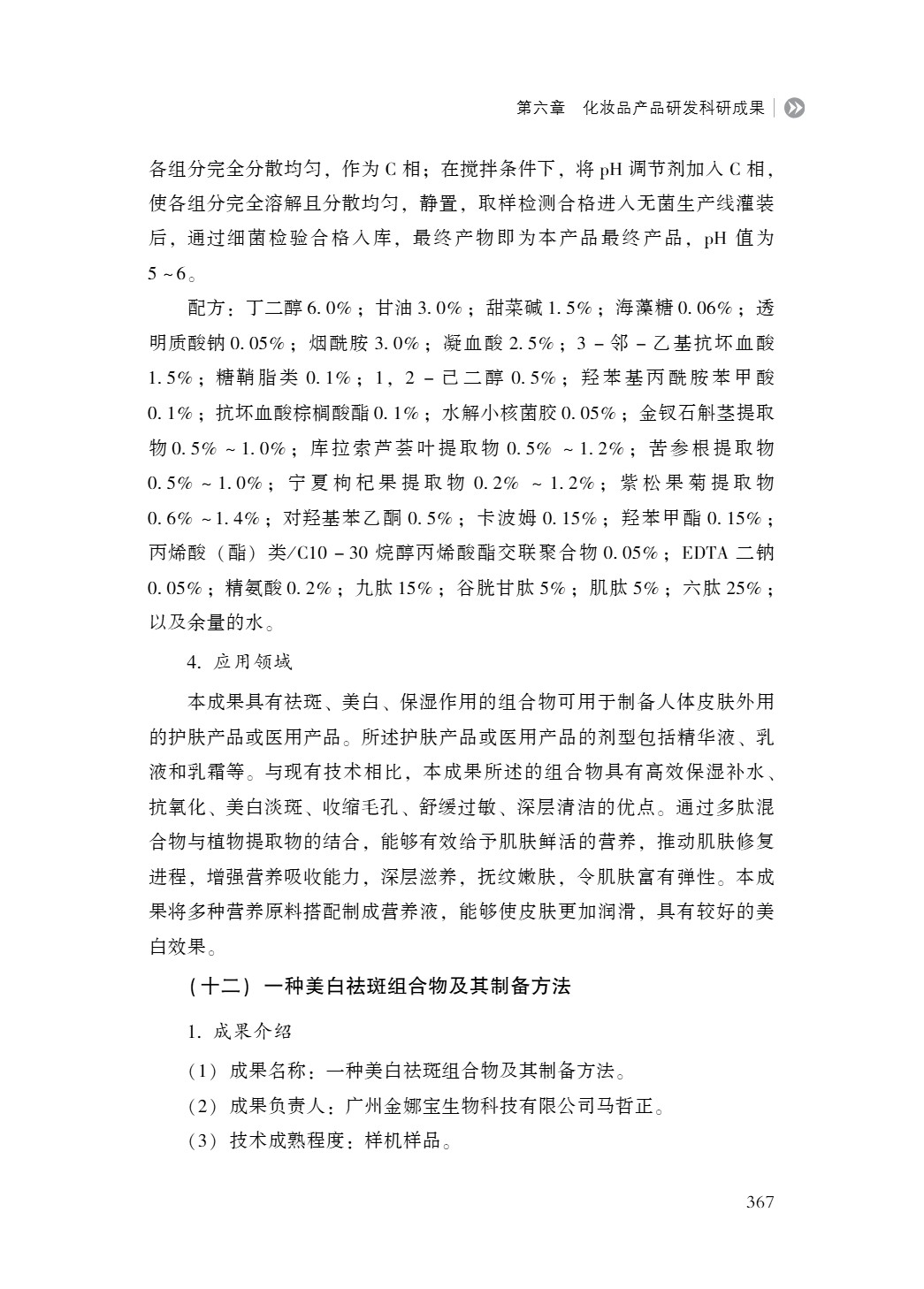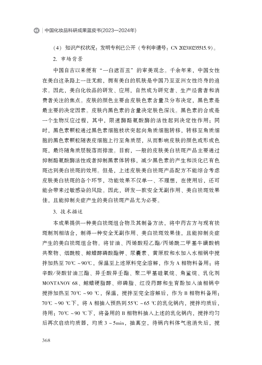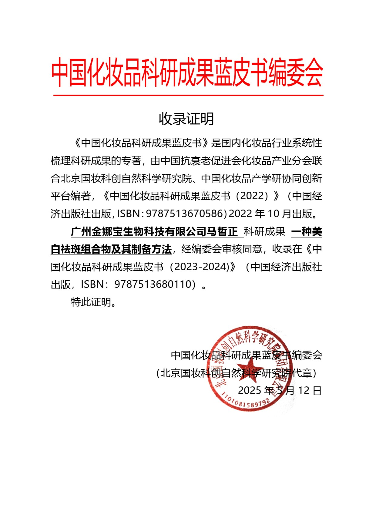 中国化妆品科研成果蓝皮书(2023-2024)》成果展示|广州金娜宝生物科技有限公司马哲正:一种美白祛斑组合物及其制备方法 日期: 2025-12-16 来源: 浏览: 10