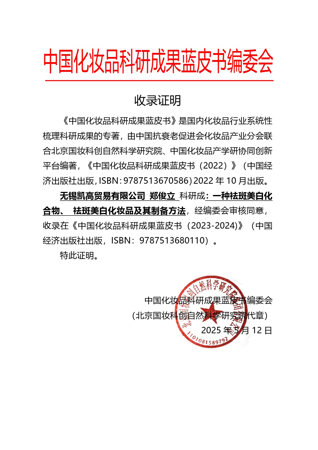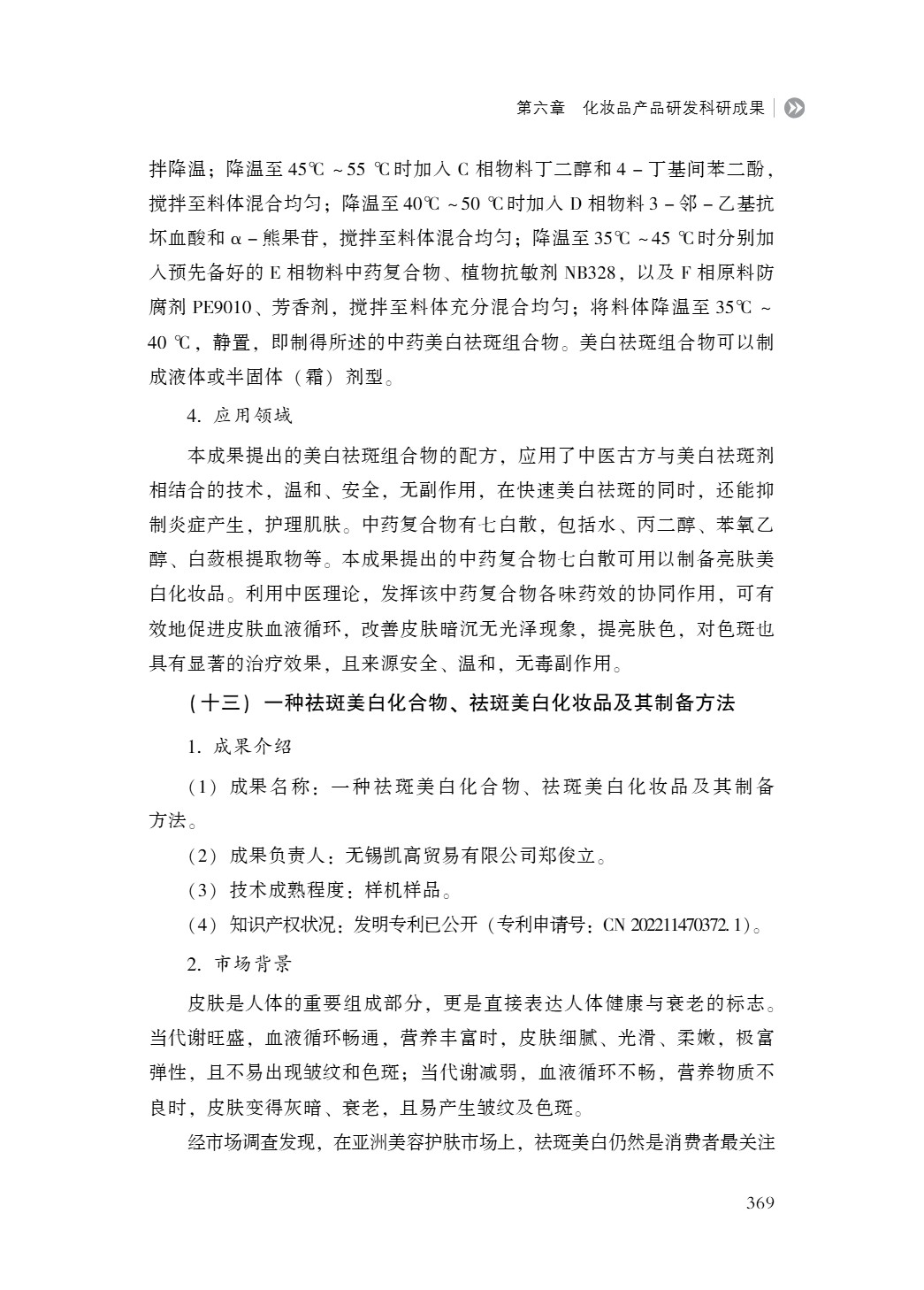 中国化妆品科研成果蓝皮书(2023-2024)》成果展示|无锡凯高贸易有限公司郑俊立:一种祛斑美白化合物、 祛斑美白化妆品及其制备方法 日期: 2025-12-17 来源: 浏览: 4