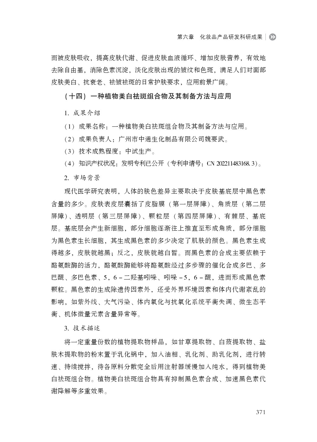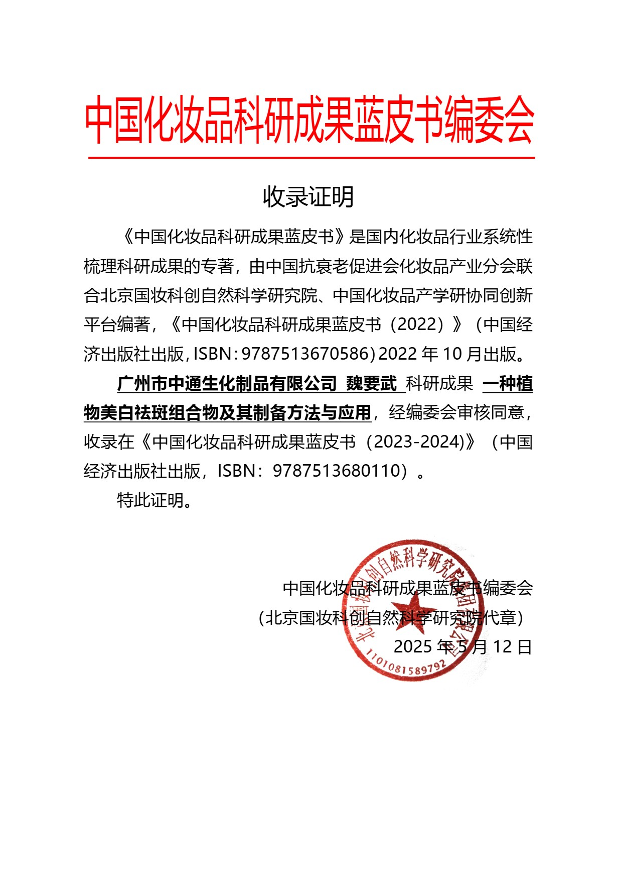 中国化妆品科研成果蓝皮书(2023-2024)》成果展示|广州市中通生化制品有限公司魏要武:一种植物美白祛斑组合物制备方法与应用 日期: 2025-12-18 来源: 浏览: 8