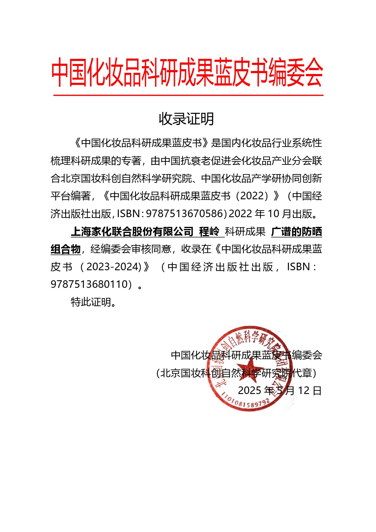 中国化妆品科研成果蓝皮书(2023-2024)》成果展示|上海家化联合股份有限公司程岭:广谱的防晒组合物 日期: 2025-12-24 来源: 浏览: 43