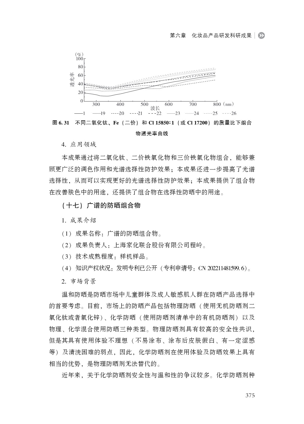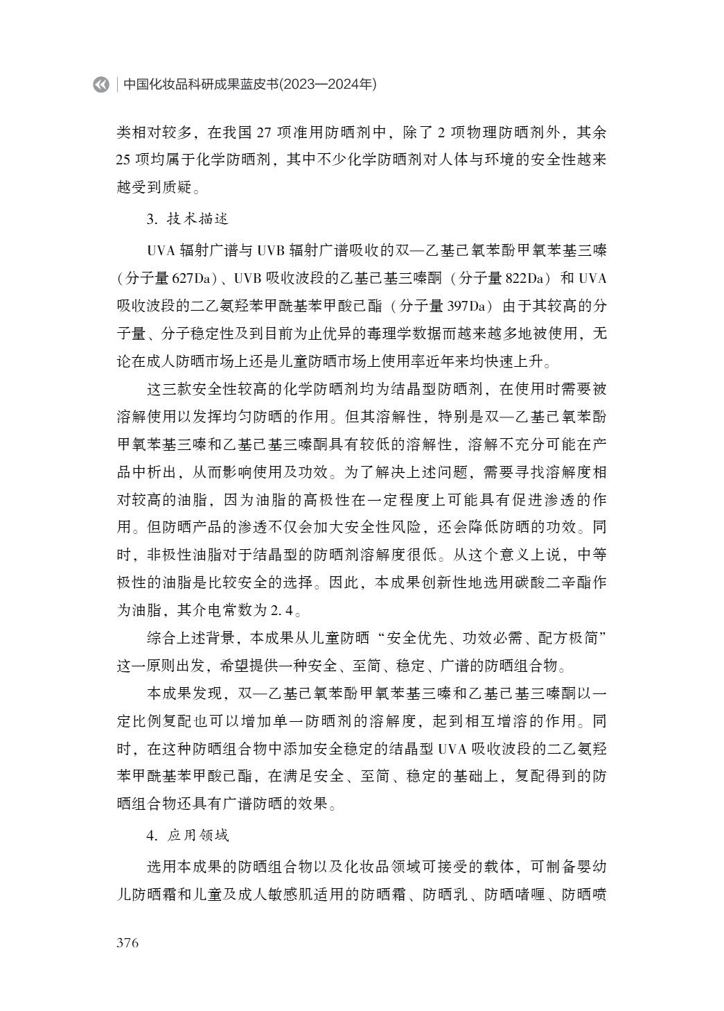 《中国化妆品科研成果蓝皮书(2023—2024 年)》由中国抗衰老促进会化妆品产业分会、北京国妆科创自然科学研究院以及中国化妆品产学研协同创新平台共同组织。全书580页,57.8万字ISBN978-7-5136-8011-0,中国经济出版出版。 蓝皮书是由国内100多位来自高校院所与企业的专家精心打造的行业权威著作,汇集了超百位科研工作者的卓越智慧与辛勤付出。作为美妆科研领域的里程碑式著作,蓝皮书自问世以来,便以“全面性、深入性、专业性”的三大特质,赢得产学研各界高度赞誉!填补国内该领域学术梳理空白,为行业制定标准、技术革新、产业升级提供权威战略指南。 上海家化联合股份有限公司(SH.600315)是中国历史悠久的民族化妆品企业,前身可追溯至1898年,于2001年成为行业首家上市公司。公司实施“聚焦核心品牌、品牌建设、线上发展与效率提升”四大战略,旗下拥有六神、玉泽、佰草集等知名品牌,并通过以品牌为中心的扁平化组织推动发展。公司注重研发创新,在全球拥有两大科创中心、五大工厂及455项有效专利,年产能达9亿件。上海家化积极践行ESG管理,获得MSCI A级等行业领先的可持续发展评级,致力于成为辐射全球的一流日化企业。 广谱的防晒组合物