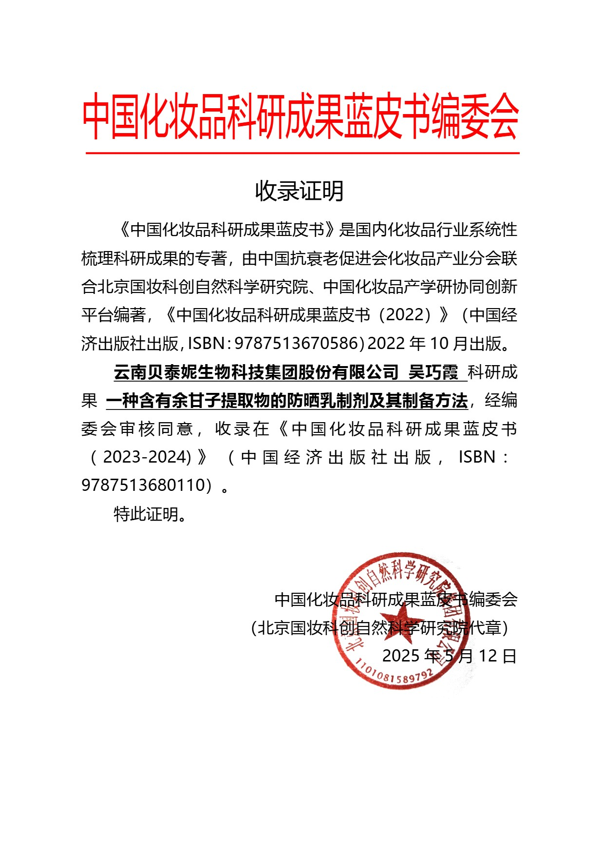 中国化妆品科研成果蓝皮书(2023-2024)》成果展示|云南贝泰妮生物科技集团股份有限公司吴巧霞:余甘子提取物的防晒乳制剂及其制备方法 日期: 2025-12-30 来源: 浏览: 83