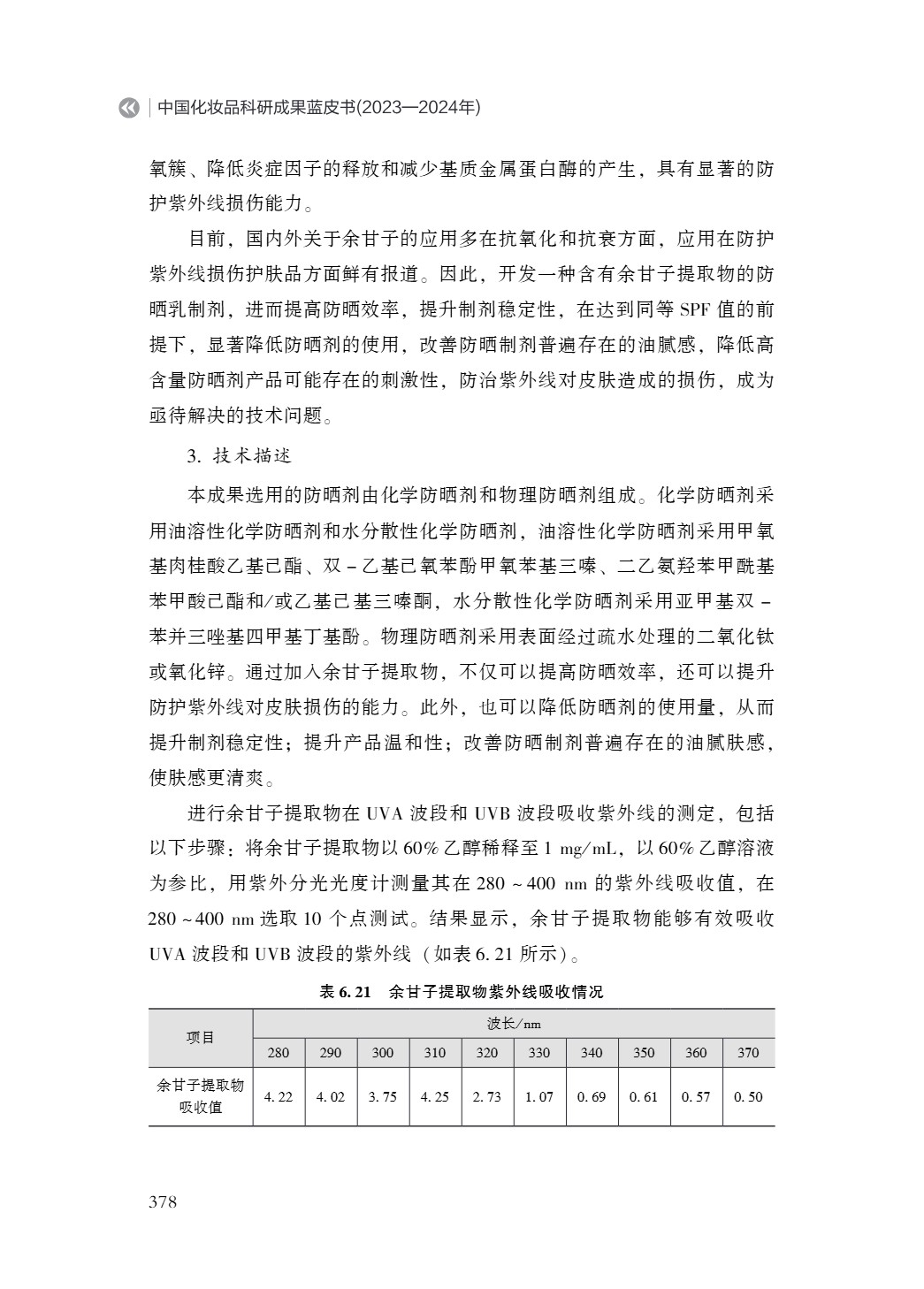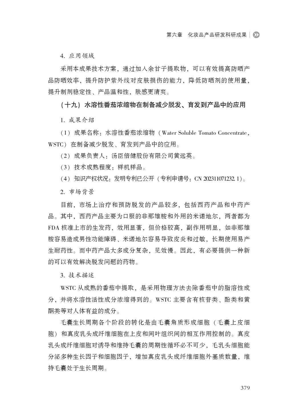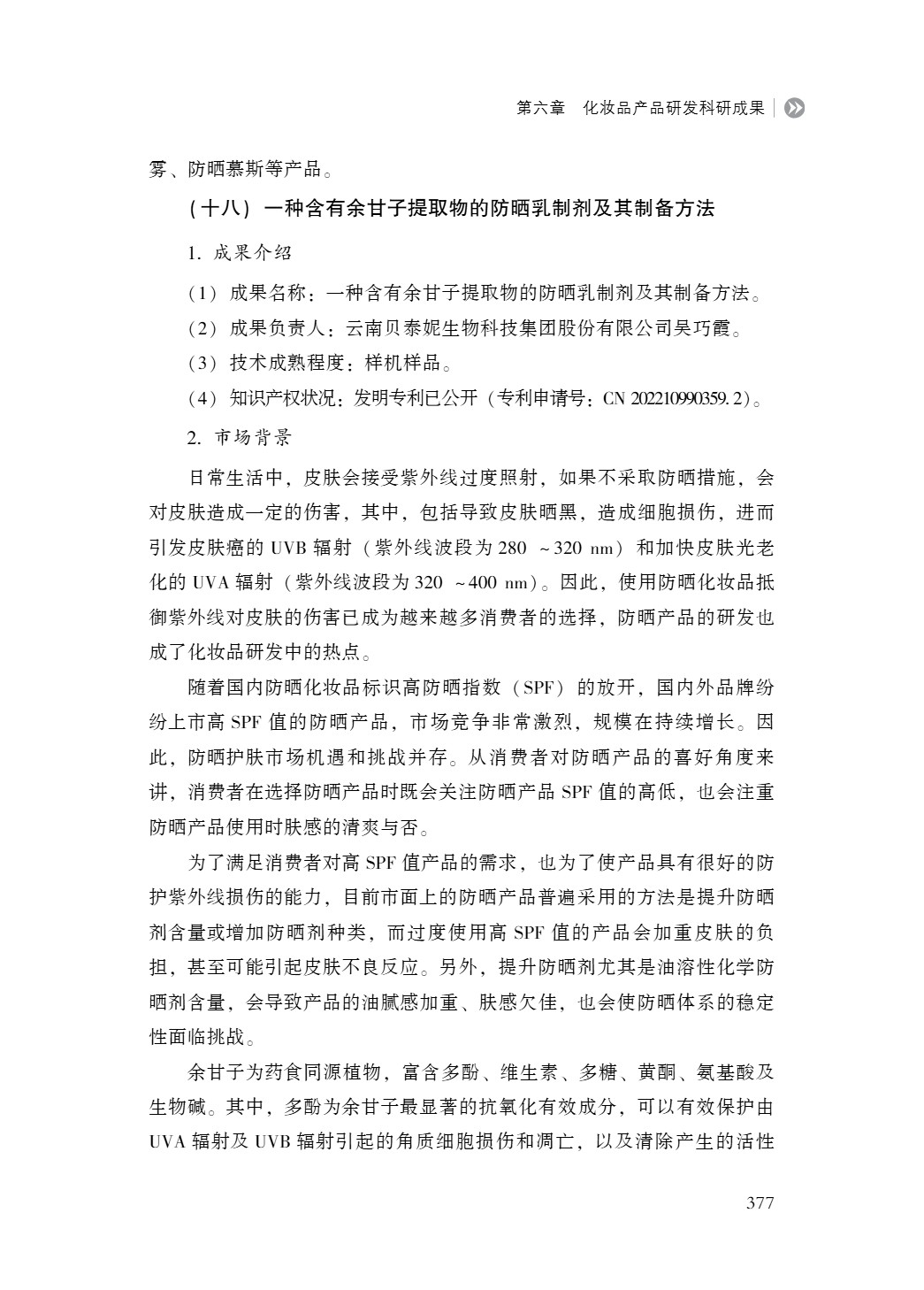 《中国化妆品科研成果蓝皮书(2023—2024 年)》由中国抗衰老促进会化妆品产业分会、北京国妆科创自然科学研究院以及中国化妆品产学研协同创新平台共同组织。全书580页,57.8万字ISBN978-7-5136-8011-0,中国经济出版出版。 蓝皮书是由国内100多位来自高校院所与企业的专家精心打造的行业权威著作,汇集了超百位科研工作者的卓越智慧与辛勤付出。作为美妆科研领域的里程碑式著作,蓝皮书自问世以来,便以“全面性、深入性、专业性”的三大特质,赢得产学研各界高度赞誉!填补国内该领域学术梳理空白,为行业制定标准、技术革新、产业升级提供权威战略指南。 贝泰妮集团成立于2010年,是一家定位于皮肤健康护理互联网+的大健康产业集团,集研发、生产与营销于一体,致力于打造中国皮肤健康生态链,推动皮肤护理大健康事业发展。作为国家高新技术企业及国家教育部创新团队,公司依托云南高原植物资源,融合植物学、生物学与皮肤学前沿科技,开创多项专利技术,旗下核心品牌“薇诺娜”以皮肤学级温和配方及国际GMPC生产标准,赢得了消费者与专业人士的广泛认可。凭借线上线下融合的营销网络,包括电商平台、OTC渠道、专卖店及线上服务平台“逑美APP”,贝泰妮实现了O2O跨界运营与持续高速增长,以研发实力与创新模式为核心,立足云南、辐射全国,持续深耕皮肤健康生态链的未来发展。 一种含有余甘子提取物的防晒乳制剂及其制备方法