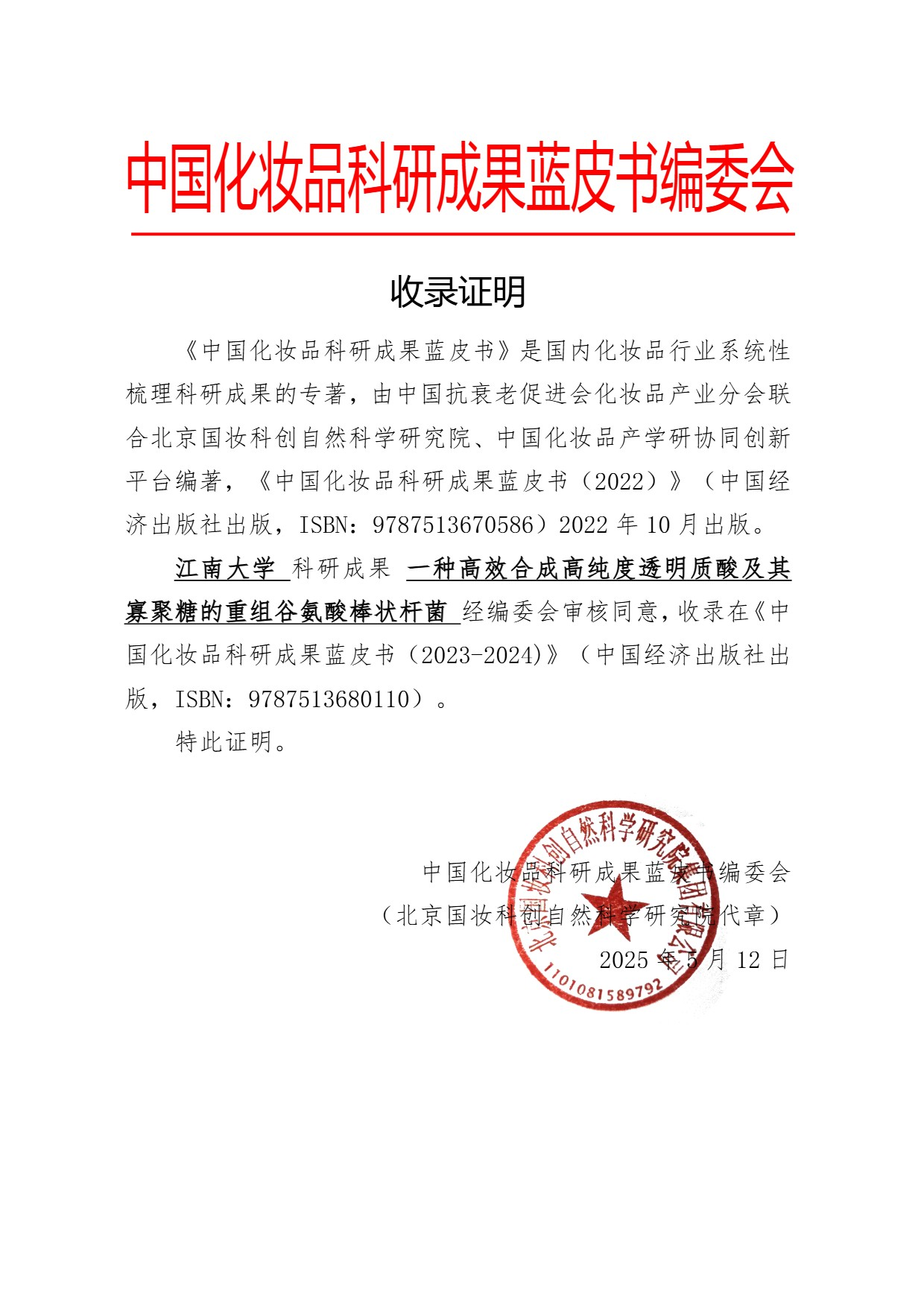 江南大学:一种高效合成高纯度透明质酸及其寡聚糖的重组谷氨酸棒状杆菌 |《中国化妆品科研成果蓝皮书(2023-2024)》成果展示 日期: 2026-01-17 来源: 浏览: 53