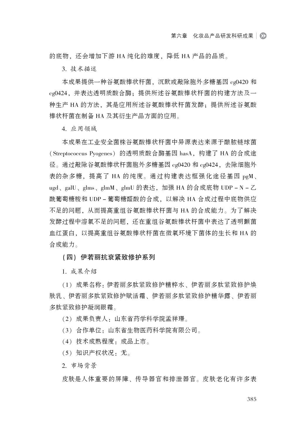 《中国化妆品科研成果蓝皮书(2023—2024 年)》由中国抗衰老促进会化妆品产业分会、北京国妆科创自然科学研究院以及中国化妆品产学研协同创新平台共同组织。全书580页,57.8万字ISBN978-7-5136-8011-0,中国经济出版出版。 蓝皮书是由国内100多位来自高校院所与企业的专家精心打造的行业权威著作,汇集了超百位科研工作者的卓越智慧与辛勤付出。作为美妆科研领域的里程碑式著作,蓝皮书自问世以来,便以“全面性、深入性、专业性”的三大特质,赢得产学研各界高度赞誉!填补国内该领域学术梳理空白,为行业制定标准、技术革新、产业升级提供权威战略指南。 成果负责院校: 江南大学 江南大学是教育部直属国家“211工程”和“双一流”建设高校,源于1902年的三江师范学堂,历经多次整合发展,于2001年由无锡轻工大学、江南学院等合并组建而成。学校秉承“笃学尚行,止于至善”的校训,坚持以轻工特色服务国计民生,致力于建设中国特色、世界一流的研究型大学,在人才培养、科学研究、社会服务等方面取得显著成就,已成为国内外享有声誉的特色鲜明的高水平大学。 合作单位: 华熙生物科技股份有限公司 熙生物(688363.SH)成立于 2000 年,是一家跨国生物科技与生物制造企业,致力于通过科技创新引领全球健康与美丽事业。公司率先实现透明质酸的生物制造,确立了在糖类物质及其他生物活性物生产领域的全球领先地位。凭借在高端透明质酸研发中的突破性技术,华熙生物已成为众多世界顶尖高校、科研机构、医院及世界 500 强企业信赖的合作伙伴,并以纯粹的科学探索愿景,深入参与糖生物学与细胞生物学的前沿研究。 一种高效合成高纯度透明质酸及其寡聚糖的重组谷氨酸棒状杆菌