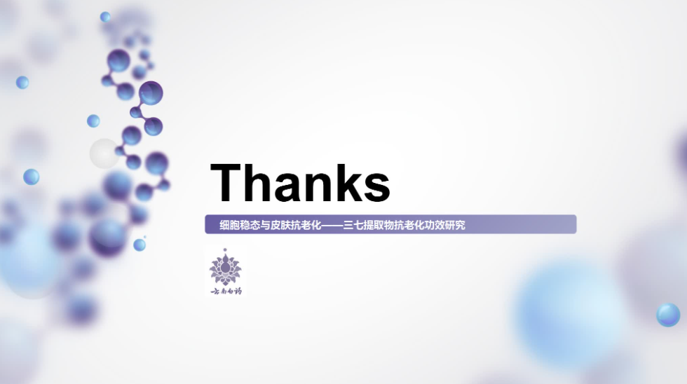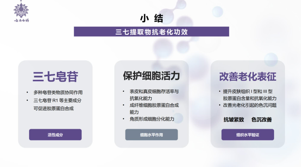 最后,报告由表及里地对三七提取物抗老化功效进行了总结,得出了外在方面三七提取物能够改善老化标征,内源方面三七提取物可以保持细胞活力的结论。