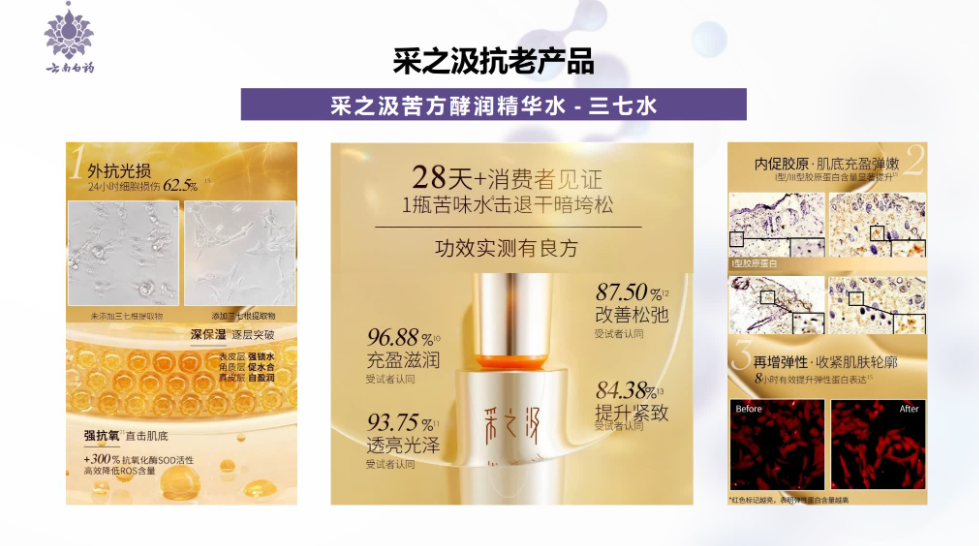 报告强调,三七抗衰成分的研究需结合现代植物化学与皮肤科学,通过精准提取技术保留其核心活性物质。云南白药采之汲依托百年药植研究经验,对三七进行系统性功效解析,发现了其能促进胶原蛋白合成、抑制炎症因子释放的特性,为抗衰护肤提供科学依据。