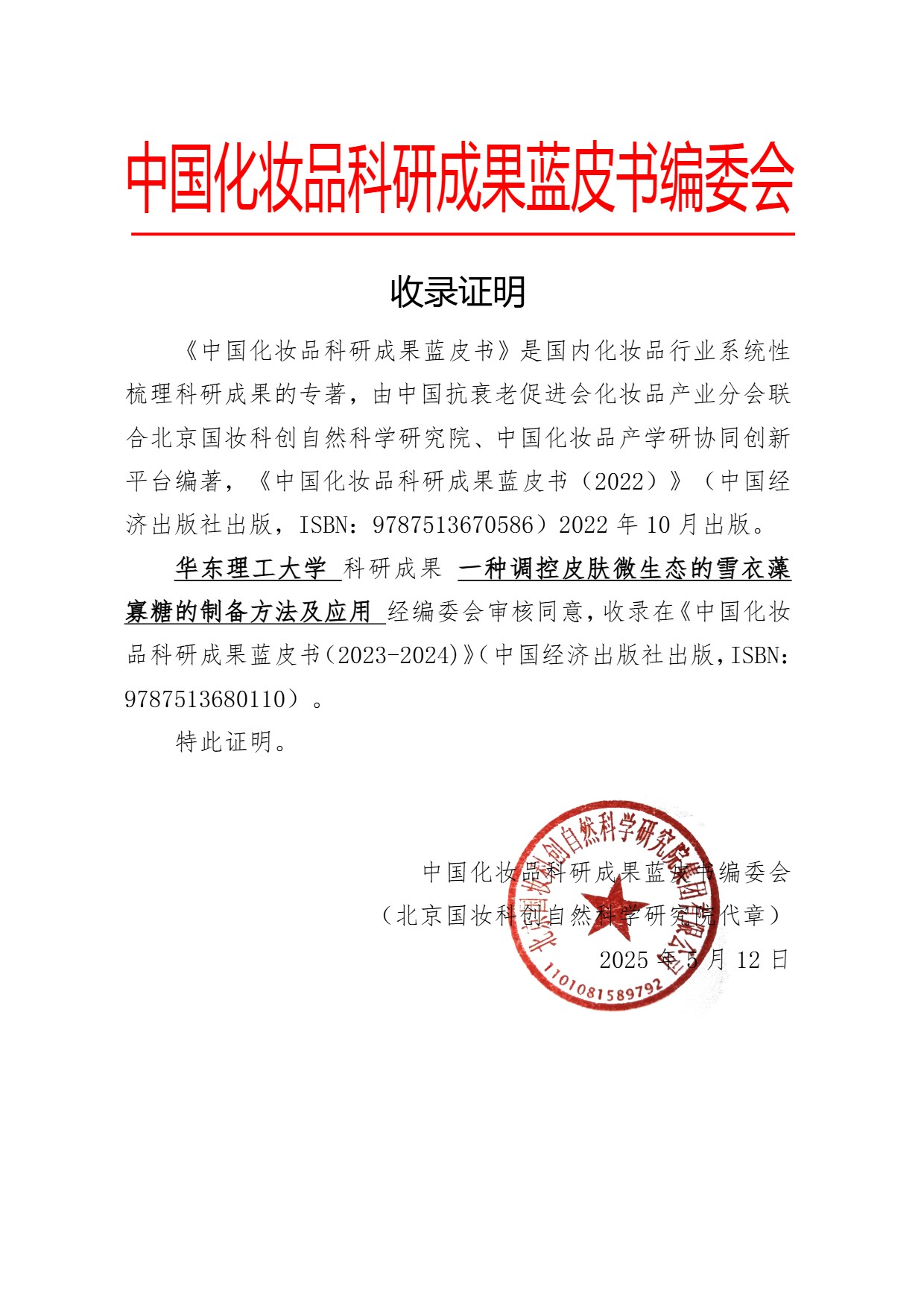 《中国化妆品科研成果蓝皮书(2023—2024 年)》由中国抗衰老促进会化妆品产业分会、北京国妆科创自然科学研究院以及中国化妆品产学研协同创新平台共同组织。全书580页,57.8万字ISBN978-7-5136-8011-0,中国经济出版出版。 蓝皮书是由国内100多位来自高校院所与企业的专家精心打造的行业权威著作,汇集了超百位科研工作者的卓越智慧与辛勤付出。作为美妆科研领域的里程碑式著作,蓝皮书自问世以来,便以“全面性、深入性、专业性”的三大特质,赢得产学研各界高度赞誉!填补国内该领域学术梳理空白,为行业制定标准、技术革新、产业升级提供权威战略指南。 成果负责院校: 华东理工大学 华东理工大学始建于1952年,原名华东化工学院,由交通大学(上海)、震旦大学(上海)等多校化工系合并组建,是新中国第一所化工特色高等学府。学校先后入选全国重点大学、“211工程”、“985工程优势学科创新平台”及国家“双一流”建设高校,化学、材料科学与工程、化学工程与技术入选一流学科。现拥有徐汇、奉贤等校区,涵盖12个学科门类,化学、材料科学、工程学等12个学科进入ESI全球前1%,其中3个进入前1‰。学校现有全日制在校生约3.2万人,教职工近3000人,包括院士11人。建有多个国家级科研平台,取得丰硕创新成果,并与全球200多所高校和机构开展合作。华东理工大学正以“双一流”建设为引领,深入实施“四化”战略,努力建设成为特色鲜明的世界一流大学,为教育强国和中国式现代化贡献力量。 合作单位: 前研化妆品科技 (上海) 有限公司 前研化妆品科技(上海)有限公司是一家专注于化妆品研发、生产与技术服务的创新型企业。公司依托纳米油脂乳化技术、鳞式仿生技术等国际领先成果,以及10余项配方与原料发明专利,为行业提供从实验室到成品的一站式RDM创新解决方案。在四年间,其年产值实现从2000万元到1.2亿元的跨越式增长,形成了研发运营位于上海松江、生产制造布局于长三角周边城市的协同发展模式。公司不仅参与制定无硅洗发水护理技术标准,其研发成果也被收录于《中国化妆品产业研究报告(2024)》,并通过与国内头部企业合作,助力多款产品累计实现超20亿元GMV。 一种调控皮肤微生态的雪衣藻寡糖的制备方法及应用