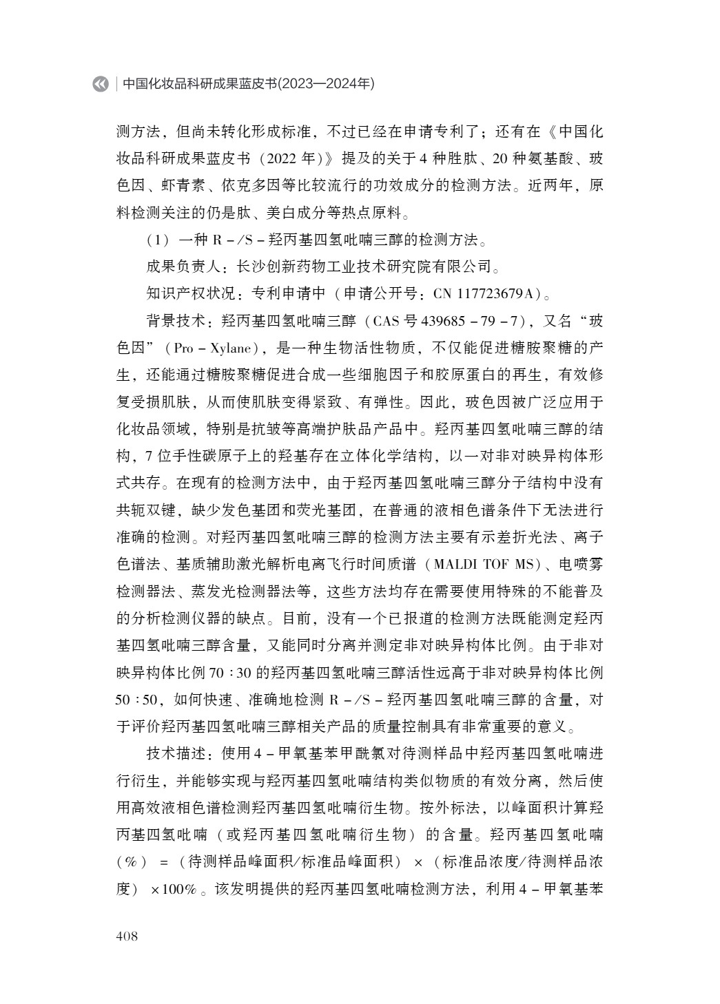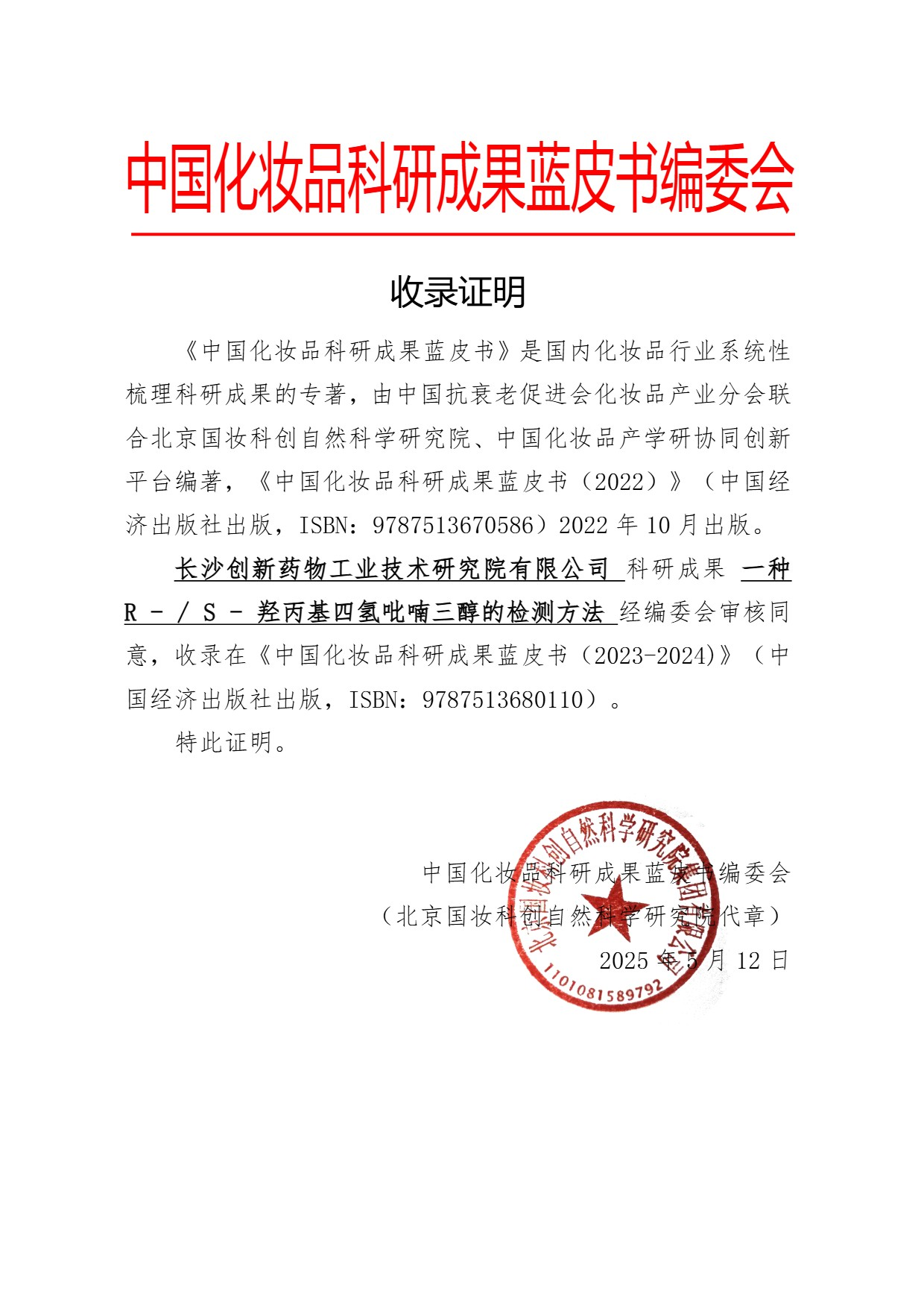 长沙创新药物工业技术研究院有限公司:一种 R - / S - 羟丙基四氢吡喃三醇的检测方法|《中国化妆品科研成果蓝皮书(2023-2024)》成果展示 日期: 2026-01-25 来源: 浏览: 25