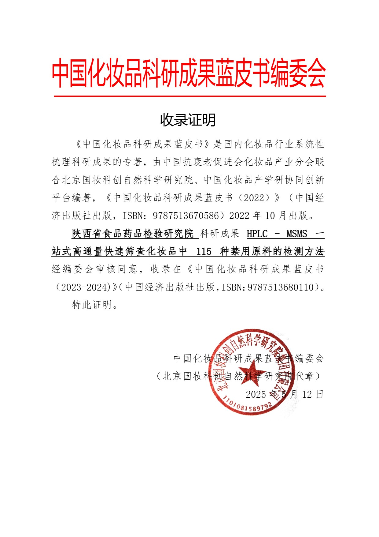 陕西省食品药品检验研究院:HPLC - MSMS 高通量快速筛查化妆品中禁用原料检测方法|《中国化妆品科研成果蓝皮书(2023-2024)》成果展示 日期: 2026-01-27 来源: 浏览: 34