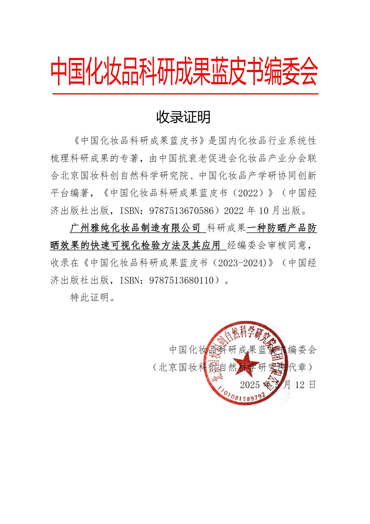 广州雅纯化妆品制造有限公司:一种防晒产品防晒效果的快速可视化检验方法及其应用|《中国化妆品科研成果蓝皮书(2023-2024)》成果展示 日期: 2026-03-18 来源: 浏览: 5