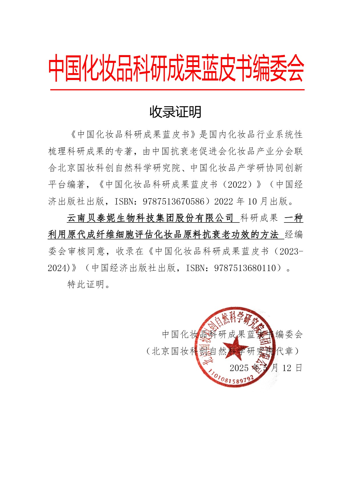 云南贝泰妮生物科技集团股份有限公司:一种评估化妆品原料抗衰老功效的方法|《中国化妆品科研成果蓝皮书(2023-2024)》成果展示 日期: 2026-03-24 来源: 浏览: 10