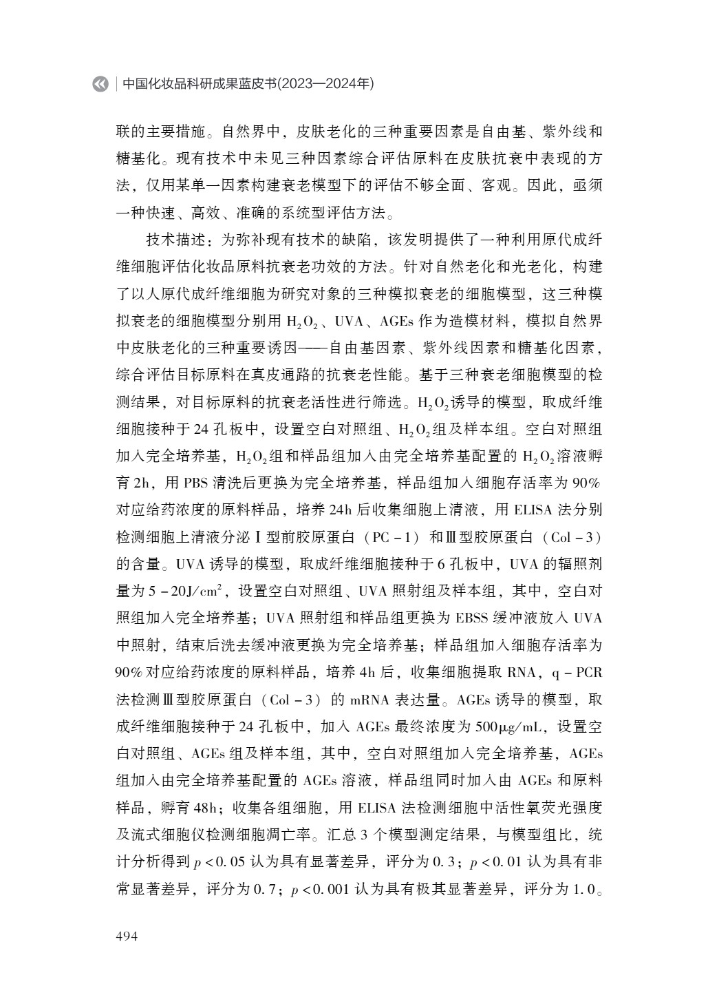 《中国化妆品科研成果蓝皮书(2023—2024 年)》由中国抗衰老促进会化妆品产业分会、北京国妆科创自然科学研究院以及中国化妆品产学研协同创新平台共同组织。全书580页,57.8万字ISBN978-7-5136-8011-0,中国经济出版出版。 蓝皮书是由国内100多位来自高校院所与企业的专家精心打造的行业权威著作,汇集了超百位科研工作者的卓越智慧与辛勤付出。作为美妆科研领域的里程碑式著作,蓝皮书自问世以来,便以“全面性、深入性、专业性”的三大特质,赢得产学研各界高度赞誉!填补国内该领域学术梳理空白,为行业制定标准、技术革新、产业升级提供权威战略指南。 成果负责人:云南贝泰妮生物科技集团股份有限公司 云南贝泰妮生物科技集团股份有限公司(股票代码:300957)成立于2010年,是一家定位于皮肤健康互联网+的大健康产业集团,旗下拥有“薇诺娜”“薇诺娜宝贝”“泊缇诗”“痘痘康”“资润”等功效性护肤品牌,并开发逑美人工智能APP及运营医疗美容机构,其中“薇诺娜”于2019年以20.5%的市占率成为中国皮肤学级护肤市场第一品牌。公司于2021年3月25日在深交所创业板上市,成为国内功效护肤领域首家上市企业,累计获得80项专利授权,牵头设立云科特色植物提取实验室,集团还设立“贝泰妮公益基金”,并发起“5.25全民护肤日”等公益活动。 一种利用原代成纤维细胞评估化妆品原料抗衰老功效的方法 张老师:13671170103 扫描下方二维码即刻订购蓝皮书