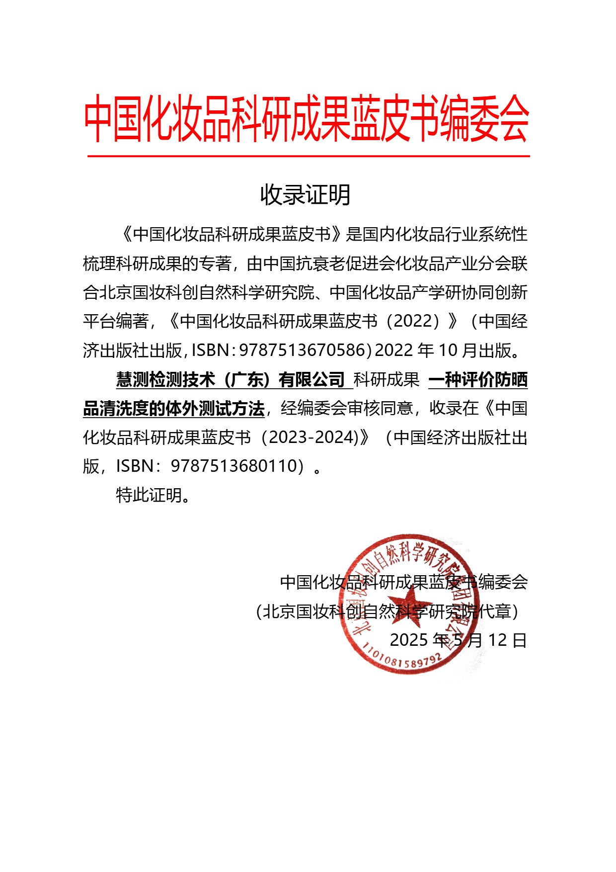 慧测检测技术 (广东) 有限公司: 一种评价防晒品清洗度的体外测试方法|《中国化妆品科研成果蓝皮书(2023-2024)》成果展示 日期: 2026-03-25 来源: 浏览: 6