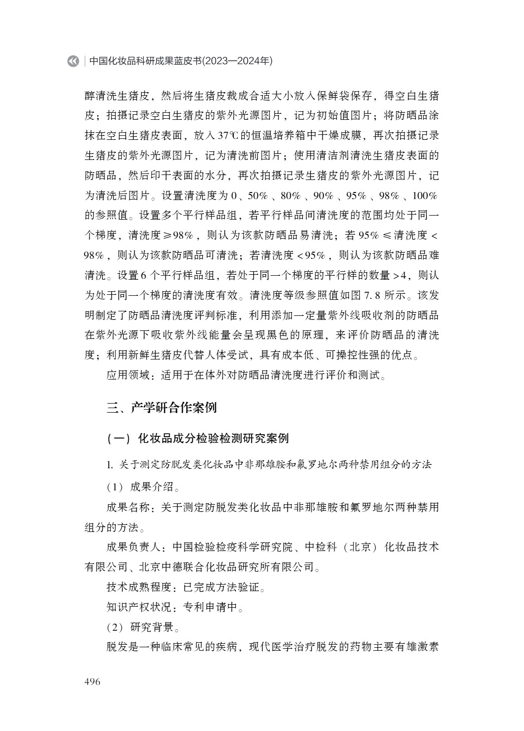 《中国化妆品科研成果蓝皮书(2023—2024 年)》由中国抗衰老促进会化妆品产业分会、北京国妆科创自然科学研究院以及中国化妆品产学研协同创新平台共同组织。全书580页,57.8万字ISBN978-7-5136-8011-0,中国经济出版出版。 蓝皮书是由国内100多位来自高校院所与企业的专家精心打造的行业权威著作,汇集了超百位科研工作者的卓越智慧与辛勤付出。作为美妆科研领域的里程碑式著作,蓝皮书自问世以来,便以“全面性、深入性、专业性”的三大特质,赢得产学研各界高度赞誉!填补国内该领域学术梳理空白,为行业制定标准、技术革新、产业升级提供权威战略指南。 成果负责人:慧测检测技术 (广东) 有限公司 慧测检测技术(广东),主营检验检测服务。拥有7项专利,主要集中在化妆品检测领域,包括评价防晒品清洗度、模拟人体环境评价保湿效果的方法,以及化妆品人体功效试验受试者管理平台等,2024年以来持续有新专利公开,保持研发投入。 一种评价防晒品清洗度的体外测试方法 张老师:13671170103 扫描下方二维码即刻订购蓝皮书
