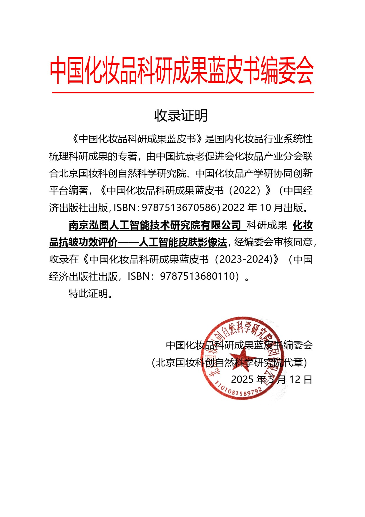 南京泓图人工智能技术研究院有限公司:化妆品抗皱功效评价——人工智能皮肤影像法|《中国化妆品科研成果蓝皮书(2023-2024)》成果展示 日期: 2026-04-01 来源: 浏览: 0